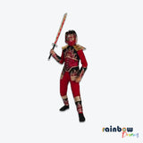 Costume includes: A jumpsuit, vest with attached shoulder guards, two boot covers, two gauntlets and a light plastic 2-piece helmet.
